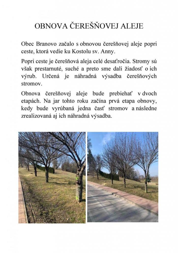 Obec Branovo začalo s obnovou čerešňovej aleje popri ceste, ktorá vedie ku Kostolu sv. Anny.